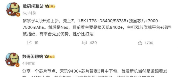 根据站哥的爆料,天玑9400+暂定3月中下旬发布,首发机型应该是OPPO迭代旗舰手机,该机将在4月初上市。随后iQOO Neo10s Pro正式登场,处理器换成了天玑9400+,核心卖点是旗舰双芯平台和超声波指纹,搭配极致性价比还是很值得期待的。